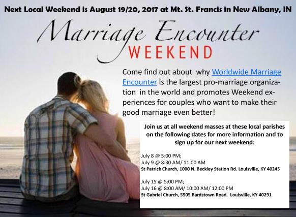 Join us at all masses at St. Patrick the weekend of July 8 and 9 or at St. Gabriel the weekend of July 15 and 16 for more information or to sign up for the upcoming Marriage Encounter Weekend on August 19th and 20th, 2017!
